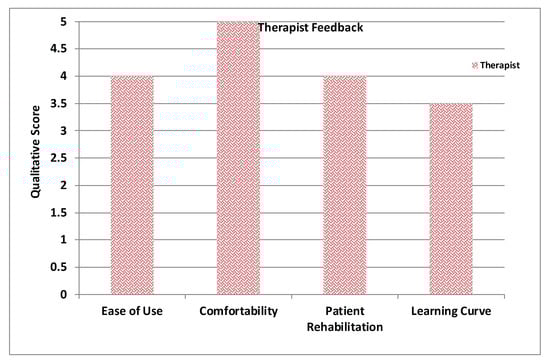 All plots demonstrate satisfaction results on a scale from 0 to 5. In general, most metrics show satisfactory results, although the learning curve was mentioned as an important factor that could affect the initial sessions performance, and this can be improved by increasing the number of training sessions for both therapists and patients.