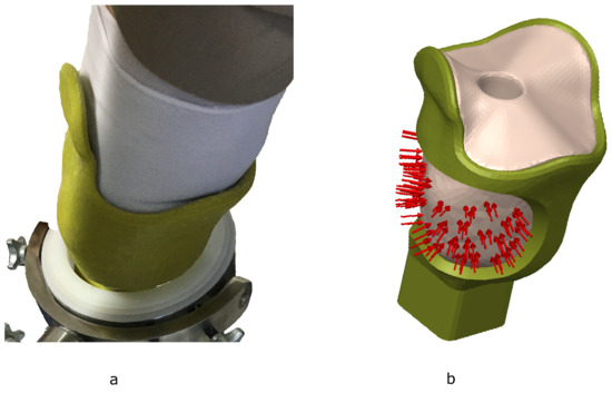 Interface pressure (IP) between lower limb residuum and socket. (a) 3D printed socket being tested by an amputee in an aluminum support block. (b) Cutout 3D model showing the pressure exerted by the prosthetic socket over the interface area of the residual limb.