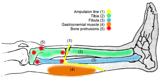 Amputation line for the transtibial amputee showing residual anatomy points of pressure over soft tissue. The bone protrusions include tibial and fibula epicondyle, head of the tibia, and distal amputation line for the tibia and fibula noted in red points (based on Reference [15]).
