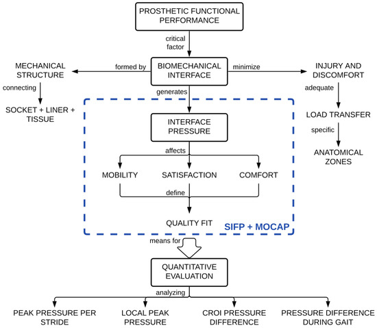 Conceptual Diagram of the problem and proposed socket interface pressure (SIFP) system shown in blue dashed line. It includes both the SIFP device and the motion capture (MOCAP) sub-system.
