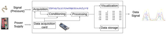 The power supply of the device is a 3 V battery of 2500 mAh. This supply includes a switch to turn on/off the system. The input of the system is the signal transmitted by the resistive type pressure sensor that sends values between 0–5 V (see Figure 6).
