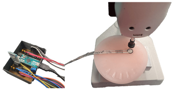 For the sensor system characterization, a dynamometer was used to apply a known force on the respective sensor’s area, an circular area of 10 mm in diameter. The forces were applied on a round piece of elastomeric material to simulate the reaction forces of the soft tissue of human skin to the compressed forces from the socket, as shown in Figure 7. The use of a soft material for the characterization of the SIFP system is important because it has similar elastic properties to those of human skin and experiences a similar deformation when a force is applied to it.