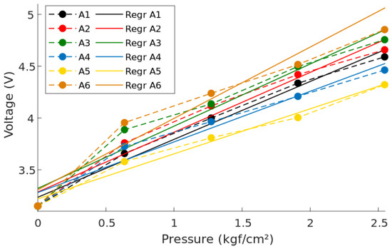 Linearization of the six pressure sensors. The dotted lines represent the obtained voltages, and the solid lines represent each sensor’s linear regression.