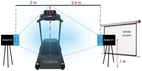 In order to keep the Kinect V1 and V2 measurements as precise as possible, the distance from the target (the centerline of the treadmill) to the Kinect sensors of each of the two versions is set to two meters according to the Kinect hardware specifications. The vertical field of view for the Kinect depth sensor V1 is of 40° and for the V2 it is of 60°. To be able to fit an average height individual on both sensor´s vertical field of view, the Kinect sensor V1 was placed 40 cm further away over the already established two meter distance from the centerline of the treadmill, as seen in Figure 10.