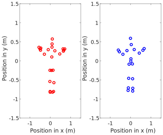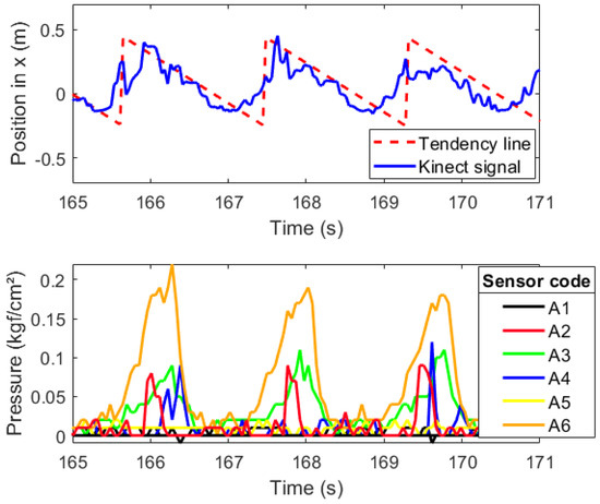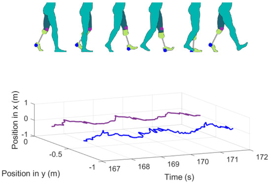 The time lapse chosen for results analysis was from the third minute of gait because that is a moment in time in which the coordinate measurement has reached a point of stability during the motion capture. Figure 16 shows in the gait cycle image a point in blue over the prosthetic foot; this point corresponds to the ankle coordinates registered by the motion capture system in time, and the x and y change in time is noted. The purple line is the knee trajectory, also noted in the left amputee gait cycle, also shown in Figure 16. Both the knee and the prosthetic foot should show, and did show, a similar movement in the x axis given the hip momentum; therefore, the x knee trajectory is smaller due to the muted movement during the gait. In the y axis, the knee and foot show a parallel distance because of their anatomical position. The motion capture system saved the positions of the limbs in time to be able to synchronize them with the pressure measurements obtained from the SIFP device.