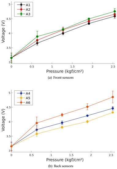 Using the known forces of each trial and the area of the sensors, the pressure was calculated in kgf/cm using the formula with cm. The voltage output at each applied force was recorded to linearize the system, using a linear function. Figure 8 shows the test voltage output and regression line for each sensor distinguished by color.