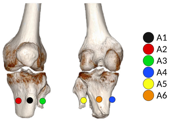 During a time lapse of six seconds, the ankle trajectory and the pressure measured between the socket and residuum were plotted together in Figure 17 to check that indeed the peaks of pressure on the residuum increased as the stance phase on the gait reached its 50% is more noticeable in sensor A6 in orange shown in Table 2. This means that, in the middle of the stance phase for the prosthesis, all the body weight is carried on the prosthetic foot, which explains the peaks on interface pressure between the residuum and the socket around 0.25 kgf/cm. Specifically, the A6 sensor showed the highest peak of pressure in the time lapse of 6 s (see Figure 17) that, according to CROI location, this sensor corresponds to the area below the popliteal region of the residuum, meaning that the posterior origin of the tibia and fibula press between the soft tissue and the socket favoring a possible pain and stress point due to the peak pressure (see Figure 18). Another elevated pressure point is located at the A3 sensor with a max peak of 0.11 kgf/cm where the tibial medial condyle is located, which is a bone bulge, just as the tibial lateral condyle which is around the A2 sensor, also showing a higher pressure peak.