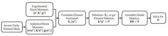 It is emphasized herein that the present iFEM formulation is based on the strain–displacement relations, and, thus, it is independent of the material properties and loading conditions of the structure. This inverse formulation can also be used regardless of the initial state of the structure, e.g., in pre-stressed structures. Although the presence of a membrane pre-stress affects the direct FE solution, due to the stiffening of the structure, it does not alter the strain–displacement relations used in iFEM. When such a structure is analyzed using iFEM, the initial structural geometry would include the pre-stressed displacement field. Any additional strains and resulting displacements would be related by the strain–displacement relations; hence, iFEM would reconstruct the latter using the former as input. A flowchart describing the various steps involved in implementing the iFEM procedure is shown in Figure 2.
