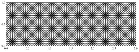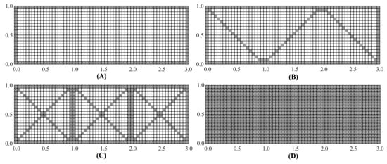 It is important to remark that the proposed strain–sensor patterns have a common design feature. All three patterns have continuous strain–sensor distributions, i.e., adjacent inverse elements in a strain–sensor pattern have strain data. Numerical studies have determined that, when discontinuous strain–sensor distributions are used, Equation (17) can result in a singular system matrix, K, hence no iFEM solution is attainable. Similarly, the strain–sensor patterns with an insufficient number of boundary elements populated with strain data can also result in a singular K matrix. This is especially true for boundary elements that have nodes where the displacement boundary conditions are prescribed. Hence, in the strain–sensor patterns examined herein, all boundary elements are instrumented with strain sensors.
