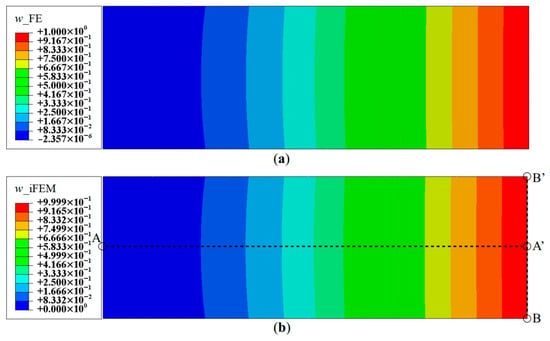 Contour plots of deflection for Mode 1: (a) FE results; and (b) iFEM results using full-field strain data (Configuration D).