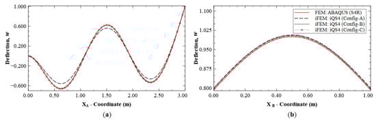 Line plots of deflection (w) for Mode 1 along: (a) section A-A′; and (b) section B-B′.