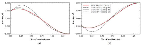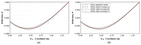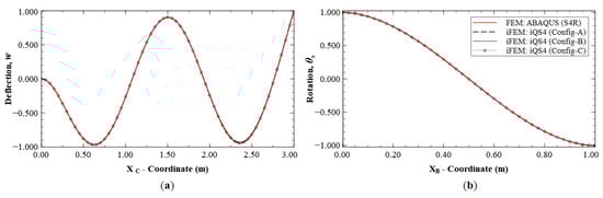The reconstruction results using Configurations A, B, and C, are plotted for Mode 1 and compared with the reference FE results. The line plots of the deflection, w, and rotation, θy, along sections A-A′ and B-B′ (see Figure 5b for the section definition), for Mode 1 are shown in Figure 6 and Figure 7. The plots indicate that the iFEM results for Mode 1 show remarkable similarity with the FE results, with a maximum error of less than 0.2% for w, and less than 0.53% for θy among the configurations. These reconstruction results are extremely accurate as they show an error of less than 1% across all the sparse configurations.