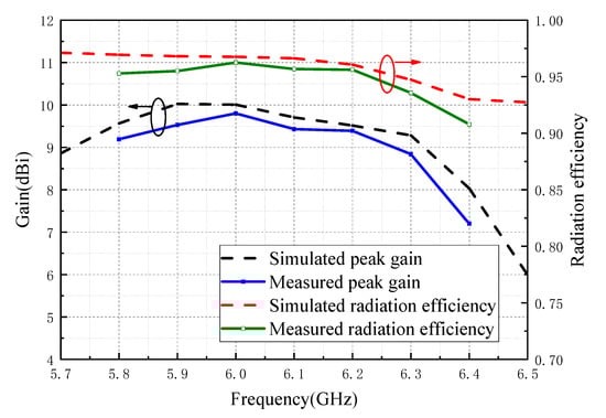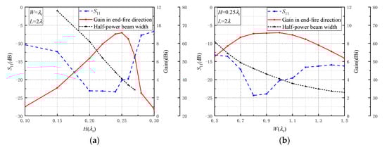 - According to the discussion about dielectric slab, the initial dimensions of the slab were set to be H = 3.99 mm (0.25λr), W = 15.97 mm (λr), and L = 100 mm (λ). To ensure the peak gain could realize 10 dBi and the HPBW could realize 40°, the length of slab was properly extended and the aperture area (H × W) was reduced by optimizing in High frequency Sounder System (HFSS.)