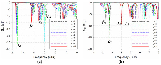 Simulated S11 characteristics of (a) the first resonant frequency of the conventional MPSA and (b) the second resonant frequency of the proposed scaled DR-CSRR-RA DGS-loaded MPSAs for the MUTs in Table 2.