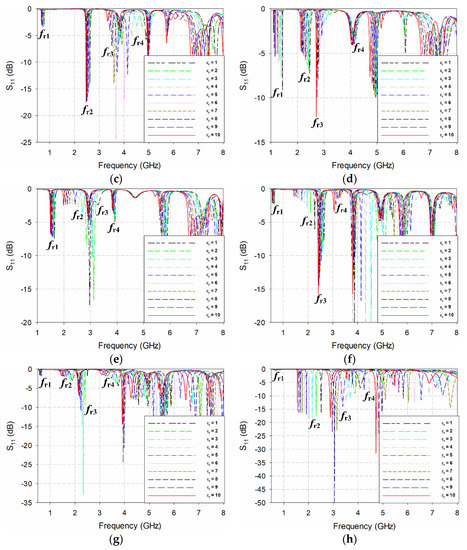 S11 characteristics when varying the relative permittivity of the MUT from 1 to 10 for: (a) the conventional MPSA without a DGS; (b) the RS DGS-loaded MPSA; (c) the SR-CSRR-OS DGS-loaded MPSA; (d) the SR-CSRR-IS DGS-loaded MPSA; (e) the R-SR-CSRR DGS-loaded MPSA; (f) the DR-CSRR-RA DGS-loaded MPSA; (g) the DR-CSRR-CA DGS-loaded MPSA; and (h) the proposed scaled DR-CSRR DGS-loaded MPSA.