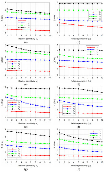 Variations on the first four resonant frequencies when varying the relative permittivity of the MUT from 1 to 10 for: (a) the conventional MPSA without DGS; (b) the RS DGS-loaded MPSA; (c) the SR-CSRR-OS DGS-loaded MPSA; (d) the SR-CSRR-IS DGS-loaded MPSA; (e) the R-SR-CSRR DGS-loaded MPSA; (f) the DR-CSRR-RA DGS-loaded MPSA; (g) the DR-CSRR-CA DGS-loaded MPSA; and (h) the proposed scaled DR-CSRR DGS-loaded MPSA.