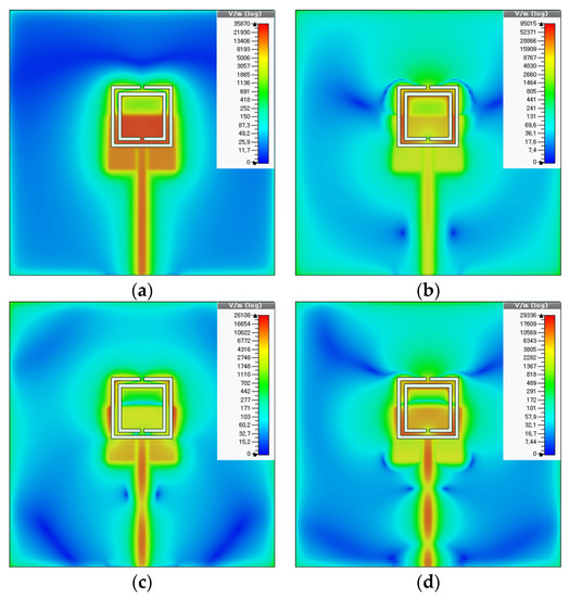 Electric field distributions on the ground plane at the first four resonant frequencies of the proposed scaled DR-CSRR-RA DGS-loaded MPSA: (a) 0.808 GHz; (b) 2.5 GHz; (c) 4.09 GHz; and (d) 5.318 GHz.