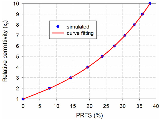 Simulated and curve-fitted relative permittivity of the material under test (MUT) vs. percent relative frequency shift (PRFS).