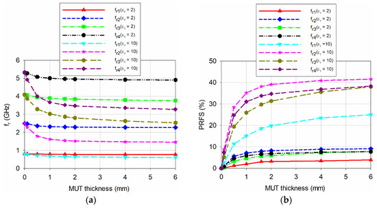 Next, the effect of varying the thickness of the MUT from 0.1 to 6 mm on the first four resonant frequencies for the proposed scaled DR-CSRR-RA DGS-loaded MPSA was investigated for εr = 2 and 10, as shown in Figure 8. As the thickness of the MUT increased, the resonant frequencies decreased and their PRFS increased with nonlinear behaviors, and the amount of decrease or increase was saturated. In addition, the most sensitive resonant frequency in terms of PRFS for varying the thickness of the MUT was the second resonant frequency.