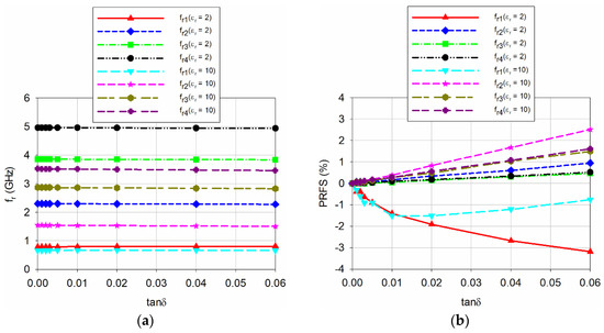 Variations on the first four resonant frequencies for the proposed scaled DR-CSRR DGS-loaded MPSA when varying the loss tangent of the MUT: (a) fr; and (b) PRFS.