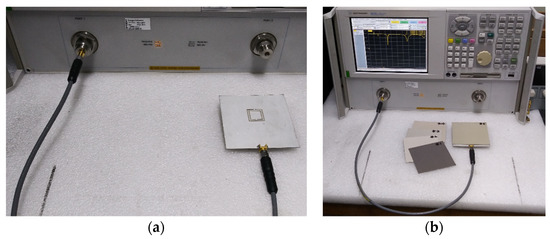 The prototypes of the conventional and the proposed scaled DR-CSRR-RA DGS-loaded MPSAs are shown in Figure 10, as fabricated on an RF-35 substrate, where εr = 3.5, tan δ = 0.0018, h = 0.76 mm. We measured the S11 characteristics using an Agilent N5230A network analyzer in an anechoic chamber to prevent interferences from external noises. Photographs of the experiment setup are in Figure 11. Five different standard dielectric MUTs from Taconic Inc. were tested. The MUTs showed relative permittivity between 2.17 and 10.2. Relative permittivity, loss tangent, and thickness [34] are summarized in Table 2.