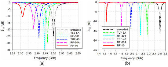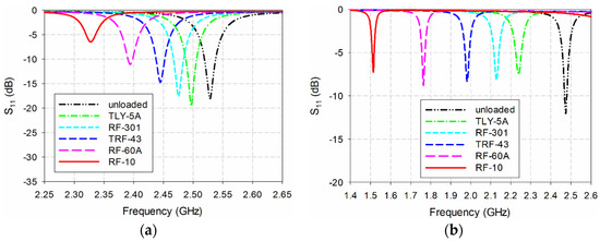 Measured S11 characteristics of (a) the first resonant frequency of the conventional MPSA and (b) the second resonant frequency of the proposed scaled DR-CSRR-RA DGS-loaded MPSAs for the MUTs in Table 2.