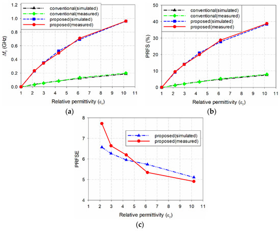 Figure 14 compares the simulated and measured sensitivities for the resonant frequencies. We used the TLY-5A (εr = 2.17), RF-301 (εr = 2.97), TRF-43 (εr = 4.3), RF-60A (εr = 6.15), and RF-10 (εr = 10.2) in turn. For the simulated results, the respective first resonant frequency shifts, Δfr, of the conventional MPSA were 0.035, 0.056, 0.088, 0.121, and 0.188 GHz, whereas the second resonant frequency shifts of the proposed scaled DR-CSRR-RA DGS-loaded MPSA were 0.230, 0.351, 0.524, 0.694, and 0.960 GHz, respectively. PRFS for the conventional MPSA were 1.40%, 2.24%, 3.52%, 4.84%, and 7.52%, respectively, whereas PRFS for the proposed scaled DR-CSRR-RA DGS-loaded MPSA were 9.20%, 14.04%, 20.96%, 27.76%, and 38.40%, respectively. PRFSE values for the second resonant frequency of the proposed scaled DR-CSRR-RA DGS-loaded MPSA were 6.57, 6.27, 5.95, 5.74, and 5.11, respectively, compared to the first resonant frequency of the conventional MPSA. Therefore, the measured sensitivity of the second resonant frequency for the proposed MPSA was 5.11 to 6.57 times higher than the first resonant frequency of the conventional MPSA.