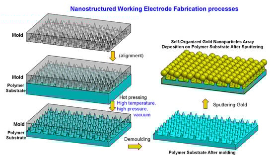 For the uniform nanostructured Working Electrode, our research team has previously developed a SERS active substrate manufacturing technology [], which produces a nanostructured PC substrate decorated with uniformly distributed and closely packed noble metal nanospheres. The SERS active substrate showed good uniformity and can be easily reproduced. In this study, we further utilized the technique to fabricate the SERS active working electrode for the integrated EC-SERS chip. Here, we briefly describe the fabrication process of a nanostructured PC substrate decorated with uniformly distributed and closely packed gold nanospheres. The manufacturing process is schematically illustrated in Figure 1. First, the structure of the aluminum substrate with a nano-conical cavity array was fabricated by using anodized aluminum self-assembly technology [,,]. The manufacturing procedure of the nano-cone hole array on the aluminum substrate included electrolytic polishing, anodization, and anodized aluminum removal. In short, an aluminum substrate (99.999% pure) was electrolytically polished with an applied voltage of 25 V in a perchloric acid and absolute ethanol mixed solution (volume ratio of 1:3.5) for 2 min. The polished aluminum substrate was anodized in a 0.3 M oxalic acid solution at a voltage of 50 volts for 2 h. The substrate was then placed in a 5 wt% phosphoric acid solution at 35 °C for 1 h to remove the anodized aluminum oxide layer. To obtain the desired nano-cone hole array structure, the anodic oxidation and anodized aluminum oxide removal processes were alternately repeated 5 times so that the holes became wide at the top and narrow at the bottom. The nanostructured anodic aluminum oxide (AAO) layer was then electroformed to obtain a nickel mold with a nanoconical cavity array structure. The nickel mold with a nanoconical cavity array structure was used as a master mold to perform thermal embossing on a PC substrate. Figure 1 illustrates the hot embossing process. A hot stamping machine was used to heat and press the nanostructured nickel mold on the surface of the PC substrate for several minutes. After cooling to room temperature, the PC substrate is demolded from the master mold to obtain a PC substrate with a nanocone array structure.