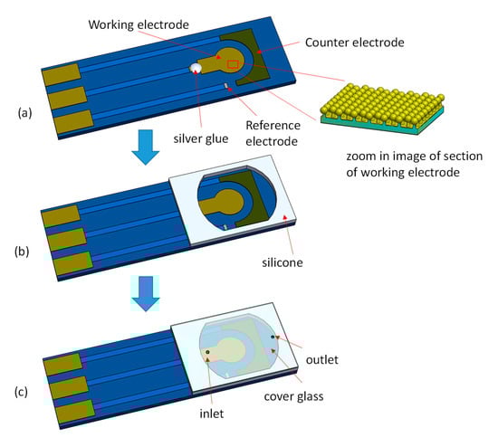 A three-electrode PCB (Figure 2a) was used as a base to combine the fabricated EC-SERS active working electrode and microfluidic reservoir (250 μL volume) into an integrated EC-SERS chip. The detailed dimension of the three-electrode PCB are as follows: Working electrode (WE): 5 mm × 2.5 mm with a circular area diameter 5 mm, Reference electrode (RE): 1.2 mm × 1.4 mm wide (silver/silver chloride), Counter electrode (CE): 13.5 mm × 4 mm (carbon). The integrated EC-SERS chip packaging process is shown in Figure 2. First, the EC-SERS active working electrode was placed in the middle of the three-electrode PCB substrate, and the working electrode was connected to the PCB substrate with silver glue. The reaction area of the three-electrode PCB substrate was then surrounded with 2 mm high silicone. Finally, the reaction area was covered with a cover glass drilled with an inlet hole and a vent hole to complete the packaging of the integrated EC-SERS chip.