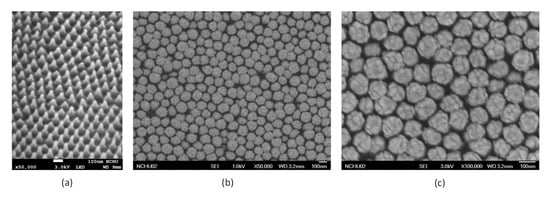 According to our previous work [], the largest area that could be realized avoiding defects by implementing hot-embossing plus sputtering process method is 120 × 80 mm. The most important step is to produce large-area AAO nanostructures by anodizing. During anodizing, if the surface electric field is unevenly distributed, it will cause uneven oxidation speed and uneven size distribution of nanostructures. Therefore, it is necessary to avoid boundary effects and ensure uniform electric field distribution. In addition, it is necessary to ensure that the pressure is evenly applied to the PC substrate during hot-embossing, otherwise the structure may be different in depth due to uneven force. A vacuum design can be considered to avoid bubbles.