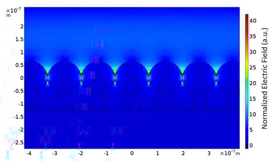 In order to further understand the influence of the nanocone array substrate decorated with gold nanospheres on the local electric field enhancement, a simulation was carried out. A commercially available finite element method (FEM) software (COMSOL Multiphysics) was used to calculate the local electric field of the gold nanospheres decorated nanocone array structure under the excitation of a 632.8 nm laser source. The average diameter of gold spheres is 133.6 nm and the standard deviation is 8.9 nm. Therefore, the diameter of gold nanospheres was set to 134 nm and the pitch between nanospheres was set to 136 nm in the simulation. The simulated profile view of the local electric field distribution around the nanospheres under the excitation laser wavelength of 632.8 nm is shown in Figure 4. The normalized electric field in this figure is the ratio between the electric field intensity created by the local surface plasmon resonance and the incident electric field intensity. We can see that due to the local surface plasmon resonance of these gold nanospheres, a strong electric field is formed around the gold nanospheres, especially between the nanospheres. These closely packed gold nanospheres can create many evenly distributed strong electric field spots (hot spots) on the chip surface. According to the electromagnetic field enhancement theory [,,], the SERS enhancement factor is proportional to the fourth power of the local electric field intensity. Therefore, these uniformly distributed hot spots can result in a very good enhancement effect for the EC-SERS signal.