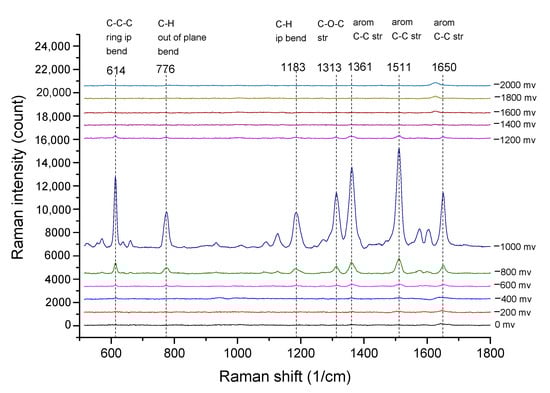 In order to evaluate the performance of the EC-SERS chip developed in this study and the influence of electrochemical potential on the intensity of Raman signals, first, we use R6G solution to measure the EC-SERS and calculate the Enhancement Factor (EF). To measure the EC-SERS spectrum of R6G, a mixed solution of 10−7 M R6G in 0.1 M NaCl supporting electrolyte was injected into the developed EC-SERS chip, and the applied potential was stepping from 0.0 V to −1.0 V with a decrement of 200 mV and recording the spectrum at the same time. Figure 5 shows the reduction stepping scanning EC-SERS spectra of R6G, which were recorded by maintaining potential at each voltage step for 10 s during the acquisition. It can be observed that as the applied potential becomes more negative, the intensity of the Raman signal becomes stronger, reaching the maximum intensity at −1.0 V. When the potential exceeds −1.0 V, the signal strength begins to decrease.