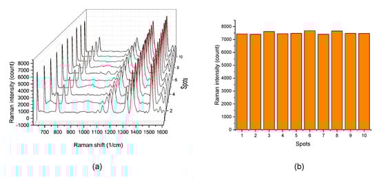 To evaluate the uniformity of the EC-SERS intensity, we used the EC-SERS detection chip developed in this research to measure the 10−7 M R6G solution. We measured the EC-SERS signal at 10 random spots on the chip with applied voltage −1.0 V. The measured Raman spectra from 10 random spots is shown in Figure 6a. The EC-SERS intensities of the Raman characteristic peak of 1511 cm−1 band from these spots are further plotted in Figure 6b for comparison. The relative standard deviation (RSD) of these EC-SERS intensities was calculated to be 1.41%. Compared with other studies [,,], the RSD value obtained here is very low, which indicates that the SERS enhancement of the developed EC-SERS chip is quite uniform and suite for quantitative measurement. In addition, compared with the SERS chip, the integrated EC-SERS chip can directly detect the analyte solution without waiting for it to dry on the SERS chip. Therefore, it is can avoid the problem of uneven distribution of the molecules to be detected due to the coffee ring effect during the drying process of the solution.