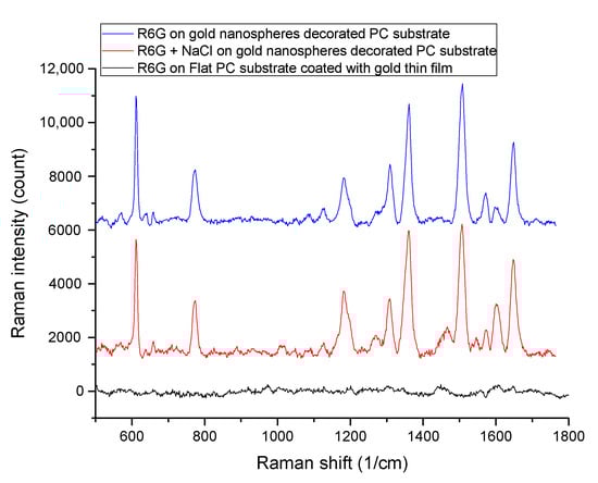 The SERS spectra of 10−5 M R6G solution with and without 0.1 M NaCl measured by gold nanospheres decorated PC substrate, and the SERS spectra of 10−5 M R6G solution on a thin gold film-coated flat PC substrate.