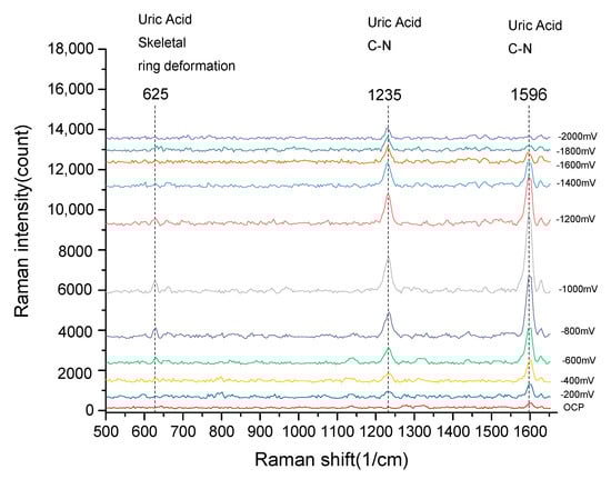 The developed EC-SERS chip was then used to measure the EC-SERS spectra of uric acid solution. The analyte solution used for uric acid EC-SERS spectra measurement was 10−4 M uric acid in 0.1 M NaCl supporting electrolyte. The analyte was then injected into the EC-SERS chip for EC-SERS spectra measurement. Same as the R6G EC-SERS spectra measurement procedure, the uric acid EC-SERS spectra were recorded by stepping the applied potential from 0.0 to −2.0 V in 200 mV decrements. Figure 8 shows the collected EC-SERS spectra of uric acid. The SERS characteristic peaks of uric acid are clearly observed from the spectra. The SERS characteristic peaks of uric acid at 625 cm−1, 1235 cm−1, and 1596 cm−1 are uric acid skeletal ring deformation vibration, C-N stretching vibration, and C-N stretching vibration, respectively. Similar to the R6G EC-SERS result, the potential-dependent of the intensity of the SERS peaks was also observed here. The intensity of the SERS peaks increases as the applied potential move toward negative and reached maximum intensity at −1.0 V. The signal intensity decreased as the applied potential move toward move negative than −1.0 V. The potential-dependent result shows that the best EC-SERS spectrum of uric acid can be detected under an applied potential of −1.0 V. Therefore, for all the following experiments, we collected the EC-SERS spectra of different uric acid concentrations under an applied voltage of −1.0 V.