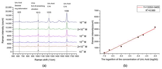In addition, we conducted the uric acid EC-SERS spectra measurements. Firstly, we measured uric acid in NaCl solution (NaCl solution as a supporting electrolyte). 4 × 10−4 M uric acid in 0.1 M NaCl was injected into the integrated EC-SERS chip for the uric acid EC-SERS spectra measurements. Same as the R6G measurements, the Raman spectrometer was used to collect Raman signals, and the portable potentiostat was used for redox scanning. Secondly, the uric acid EC-SERS spectra were measured in synthetic urine to simulate a more realistic sample. The synthetic urine was prepared according to the literature [,,]. It has considered most of the components of the real urine matrix of healthy people (potential EC-SERS interference). In order to obtain approximately 1 L of synthetic urine, 10 g of urea, 5.2 g of NaCl, 4.5 g of KCl, 4.8 g of sodium phosphate, 0.4 g of citric acid, 0.8 g of creatinine, and 50 mg of albumin were mixed with 900 mL of deionized water. The EC-SERS spectra of various uric acid concentrations in artificial urine were measured. Subsequently, the relationship between the concentration of uric acid in artificial urine and the intensity of EC-SERS was analyzed.