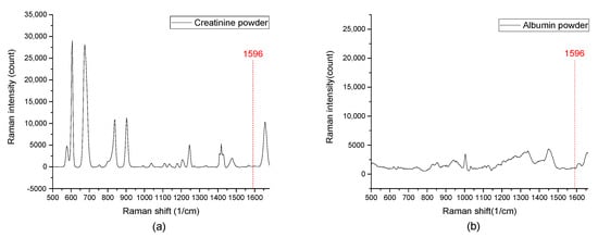 The Raman spectra of pure creatinine and albumin shown in the figure indicate that there is no strong characteristic peak overlap with the 1596 cm−1 uric acid peak. (a) The Raman spectra of creatinine powder. (b) The Raman spectra of albumin powder.