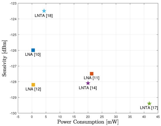 For instance, inductorless designs implementing noise and distortion cancellation techniques are presented in [,]. Moreover, a high-linearity RF receiver architecture is shown in [], adopting Miller band-pass filters for channel selection. To reduce the front-end receiver power consumption, in [] the LNTA is followed by a current mode passive mixer that provides sufficient linearity to permit coexistence with large out-of-band interference arising from other transceivers. Nevertheless, despite the enhanced linearity of LNTAs, these circuits face severe requirements for impedance matching networks and bandpass filters. As a result, occupied area enlarges significantly. In addition, to improve receiver sensitivity, LNTAs are designed to provide a sufficient gain to the weak incoming RF signals, increasing the power consumption []. In summary, the above mentioned LNTA-based designs aim to improve linearity and reduce the noise figure, at the expense of a significant increase in the power consumption.