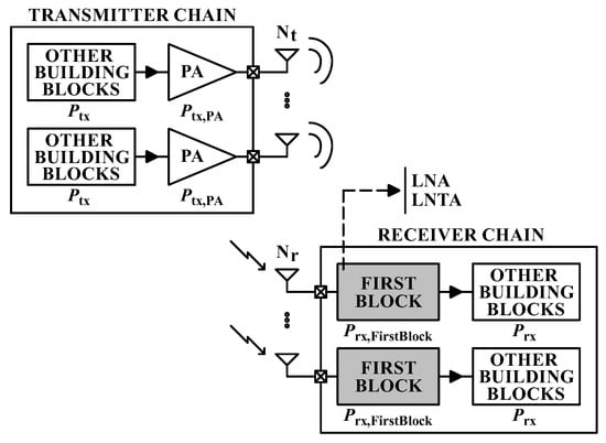 is the power amplifier (PA) consumption, with being the transmitted power that the PA forwards to the transmitter output, and represents the PA drain efficiency []. It is worth remarking that in the case of multiple active RF chains, we assume that the transmitted power is equally distributed among all PAs. Furthermore, is the power consumed by the first block at the receiver chain, depending on the employed LNA or LNTA architecture, according to Table 1. In addition, and are the power consumption of the other building blocks at the transmitter and receiver, respectively.