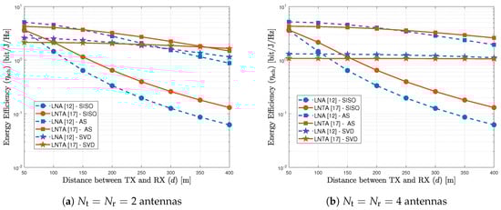 Figure 4a plots the energy efficiency as a function of the distance between transmitter and receiver considering the LNA in [] and the LNTA in [], for the SISO, AS and SVD schemes with antennas. As we can observe, the LNTA architecture at the receiver usually achieves higher energy efficiency, except for short transmission ranges with the MIMO schemes. In this example, the LNA outperforms the LNTA in terms of EE with AS when m, while this distance increases up to m with the SVD scheme. This indicates that the very low power consumption of the LNA design in [] plays an important role to maximize the EE in short transmission distances, while the lower noise figure of the LNTA from [] becomes more important when the distance increases, since it allows alleviating the transmitted power of the PA, at the transmitter side. Complementing the analysis, the importance of the spatial diversity brought by the multiple antennas becomes more evident in Figure 4b, which increases the number of antennas to . As we observe, similar conclusions can be drawn for the AS scheme, where the LNA becomes more energy efficiency for up to m. However, when submitted to the SVD scheme, the LNA presents better performance than the LNTA. The performance difference decreases when the transmission distance increases.