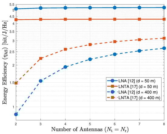 Next, Figure 5 shows the energy efficiency of the AS scheme as a function of the number of antennas, considering and m, for the LNA and LNTA architectures. As we observe, when m the LNA outperforms the LNTA in terms of energy efficiency, while this conclusion inverts for m. As previously mentioned, the noise figure of the selected LNTA is lower than that of the LNA counterpart, which becomes more important when the distance increases, regardless of the number of antennas. In addition, we also observe that the energy efficiency increases with the number of antennas up to a saturation level.