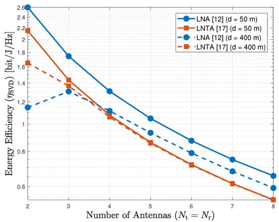 For the SVD scheme, on the other hand, there is an optimal number of antennas to maximize the energy efficiency, which depends on the transmission distance, as depicted by Figure 6 for m. Similarly as for the AS scheme, the LNA outperforms the LNTA for short transmission distances. When d increases, the LNTA performs better for a reduced number of antennas (less than 4). Improving the spacial diversity allows the LNA to surpass the LNTA, even presenting a worst noise figure. For the SVD scheme, the number of antennas determines the number of receivers. Hence, power consumption becomes a key metric in the energy efficiency performance.
