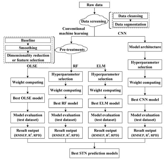Figure 1 is the workflow for STN prediction models based on Vis-NIRS. Firstly, the raw data is read-in, and data screening is carried out to cleanse and segment the dataset. Secondly, the datasets are subjected to preprocessing in conventional machine learning approaches. Finally, through each modeling process, the best model can be obtained from each specific method according to performance evaluation. The following sections expand upon the workflow in greater detail.