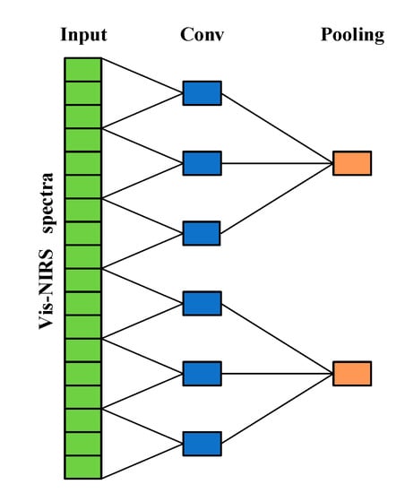 Feature processing of the receptive spectra region by one convolutional layer and one max pooling layer. This is an example of two layers with the convolutional layer having a filter size of three and stride of three and the max pooling layer having a pooling size of three. A green rectangle in the input layer represents one of the input spectral variables, a rectangle in the Conv or Pooling layer represents a neuron. One neuron in the pooling layer covers a receptive field of 9 original spectral variables, respectively.