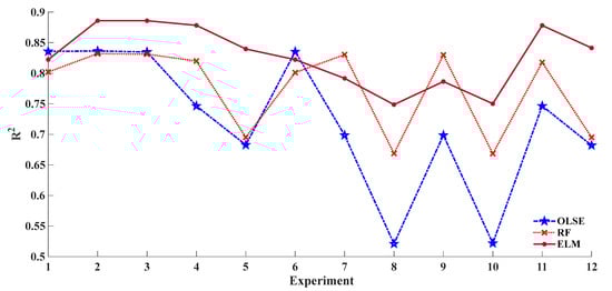 Different prediction models with the same pre-treatment result in different performance. To observe and evaluate the stability of different models, the coefficient of determination (R2) for three models are plotted in Figure 4. As we can see in Figure 4, ELM showed the best adaptation and OLSE is the worst, this is due to non-linearity of ELM.