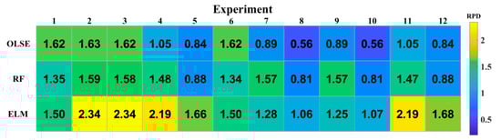 To observe and evaluate the usability of different models, the RDP heatmap was plotted in Figure 5. If RPD is below 1.5, the model performance cannot be used for STN prediction due to poor performance. If it is between 1.5 and 1.8, the model needs to be improved to get better results. For values of RPD in the range of 1.8–2, the STN prediction model is considered to be practical, and if it is higher than 2.0, the model performance is considered to be very good [28].