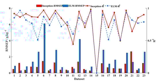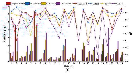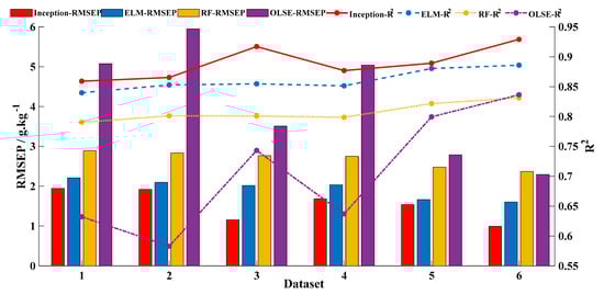 According to the above modeling results, four models with different pre-treatments are selected to compare the performance on different data properties: baseline-corrected OLSE, baseline-corrected RF, baseline-corrected and smoothed ELM; and Model 3 of CNN. The performance of each model is shown in Figure 6. R2 is marked by the lines and RMSEP is marked by the histograms. Of which, Inception model is labeled as red, ELM model is labeled as blue, RF model is labeled yellow, and OLSE model is labeled purple.