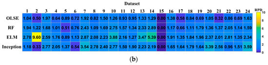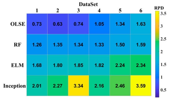 The prediction accuracy of the models is poor with small sample data, and the accuracy improves as the amount of data increases. The effects of ELM and RF changed little on different datasets, but OLSE was fluctuated significantly. To evaluate the usability of different models based on different datasets, the RDP heatmap was plotted in Figure 7. Figure 7 shows that, as the amount of data increases, the value of RPD increases. The CNN incorporated Inception module performs better than the other models with different datasets.