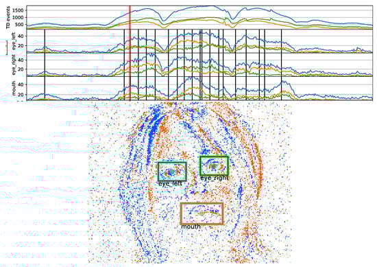 Snapshot of spatio-temporal eyes-mouth annotation of a rotating face, with a frame length and step size of 10 ms. Annotation times are shown with event rate sequences of rectangular areas displayed in the frame image (red thick line designates the frame image). Also the polarity events are plotted as time-series, and are colored differently in the frame image.
