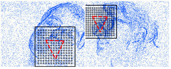 where is the scale range. This provides L density estimates, hence features to be classified for detection. Spatial pyramids of event-cells are constructed in an octave range of where represent sensor width and height. We empirically set scales in the range and . This multi-scale grid is superimposed on an initial pose prediction, , to re-sample the event-densities. Superposition aligns only for the translation and scale due to invariance to rotation and shape. This alignment is done by finding the center and scale of the points in . Scale is two times the radius which is given as the root mean square deviation from center. Two example detection grids (cell centers) at different scales with the superimposed reference triangular GPA shapes are shown in Figure 2.